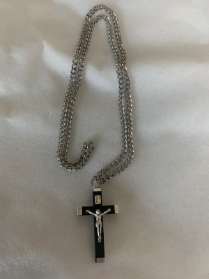 NECKLACE CRUCIFIX - WOOD BLACK - 76cm RHODIUM CHAIN |