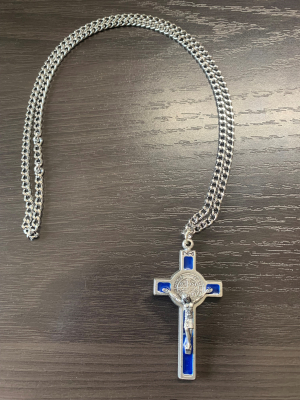CRUCIFIX - METAL ST BENEDICT BLUE (5cm x 3cm) ON 76CM RHODIUM DIPPED CHAIN |
