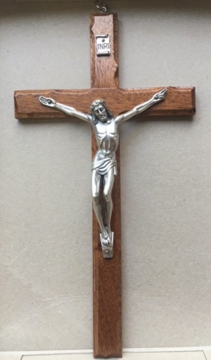 CRUCIFIX – WOOD HANGING SILVER CORPUS (15cm x 8cm)