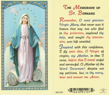 Memorare (“Remember, O Most Gracious Virgin Mary”) is a Catholic prayer seeking the intercession of the Blessed Virgin Mary. It first appears as part of a longer 15th-century prayer, “Ad sanctitatis tuae pedes, dulcissima Virgo Maria.” Memorare, from the Latin “Remember,” is frequently misattributed to the 12th-century Cistercian monk Saint Bernard of Clairvaux, apparently due to confusion with its 17th-century popularizer, Father Claude Bernard, who stated that he learned it from his own father.