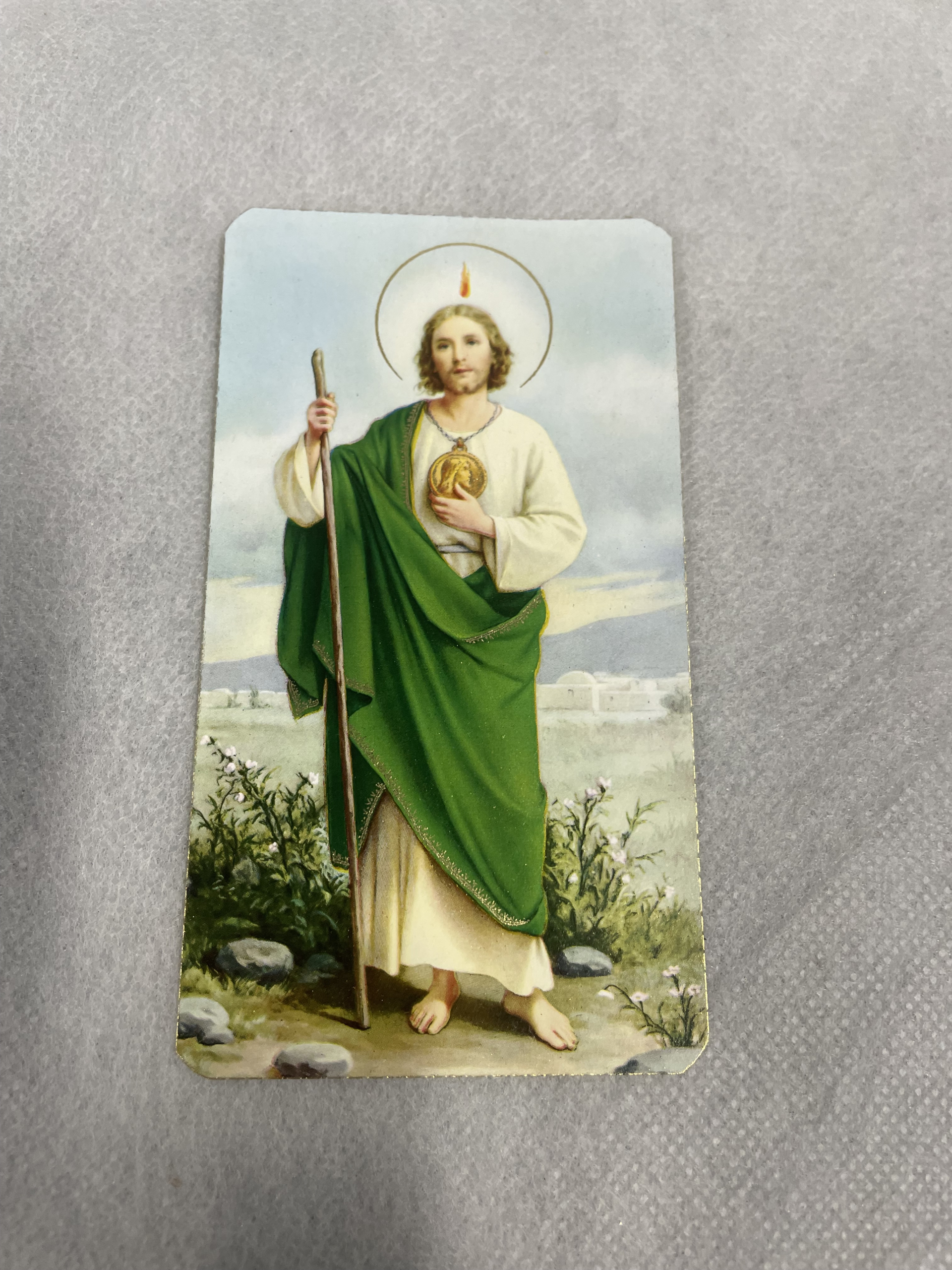 Saint Jude (or Jude Thaddaeus) was one of the twelve Apostles of Jesus, often venerated in Roman Catholicism as the patron saint of lost causes, desperate situations, and hope. He is traditionally depicted wearing green, holding an image of Jesus, or holding a club, representing his martyrdom (c. 65–66 AD).
