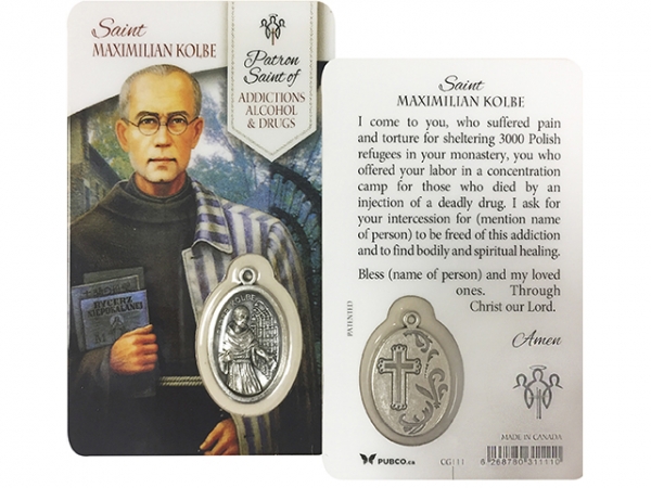 LAMINATED. PATRON SAINT CARD WITH MEDAL -ST MAXIMILIAN OF KOLBE