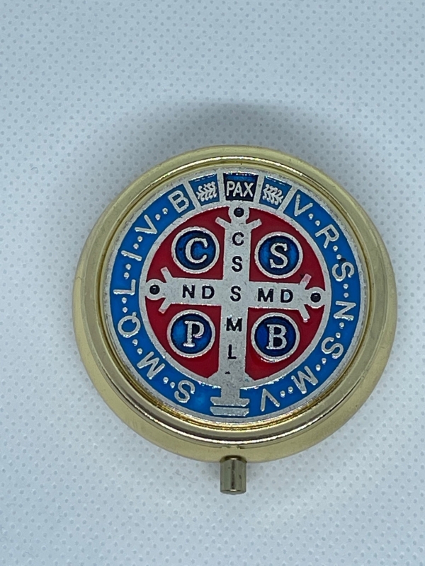 PYX – ST BENEDICT (Gold) SIZE: 5 x 2 cms Approx 38mm in diameter 13mm high – White acrylic interior lining. Hand painted St Benedict plaque – Holds approx 6-9 Hosts – Made in Italy